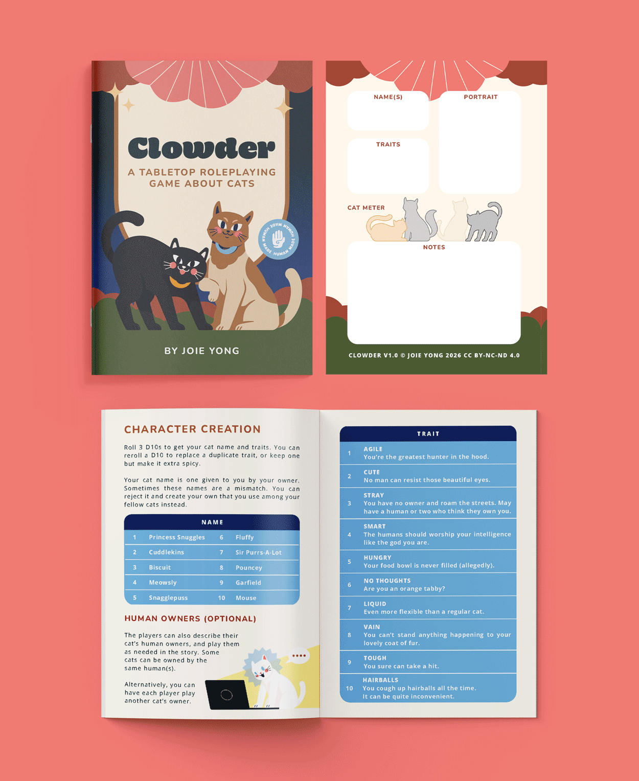 | Tags | Cats, Cozy, micro-rpg, No AI, Print & Play, rules-lite, Tabletop, tabletop-roleplaying-game, Tabletop role-playing game, zine |